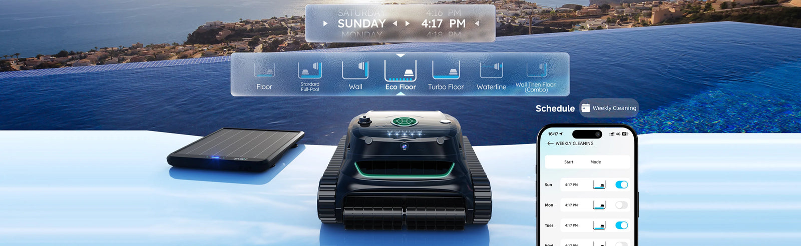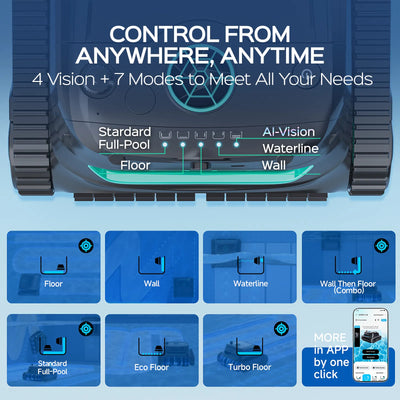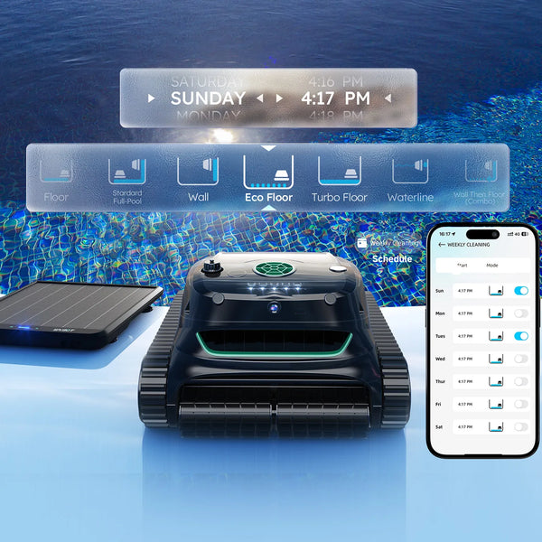 • Enhanced Scheduled Cleaning – Set weekly cleaning schedules with AI Vision mode for 20x more efficient cleaning. The robot automatically starts at preset times using AI-guided navigation. Note: AI Vision mode must be activated in the Mode interface before scheduling and works only for pool floor cleaning.
